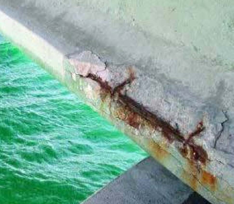 I cloruri tipici degli ambienti marini penetrano nei pori del calcestruzzo, abbassano il pH e innescano la corrosione dell’acciaio d’armatura, con conseguenti fessurazioni e perdita di durabilità.
